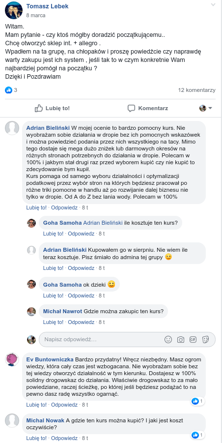 Dostęp do kursu "100 pozytywnych komentarzy na Allegro w 7 dni" oraz do zamkniętej grupy VIP na Facebook'u, otrzymasz po 15 dniach (dla tych którzy z nami zostaną).