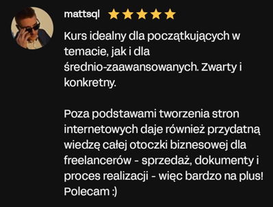 Wszystkie informacje zawarte na tej stronie stanowią osobistą opinię autora i mają charakter edukacyjny. Dołożyliśmy wszelkich starań, aby treść była rzetelna i wartościowa, jednak nie możemy zagwarantować żadnych konkretnych rezultatów wynikających z jej zastosowania. Pamiętaj, że prowadzenie działalności zarobkowej — w tym świadczenie usług, tworzenie stron internetowych czy sprzedaż online — zawsze wiąże się z ryzykiem. Również inwestycje w narzędzia, reklamę czy rozwój kompetencji mogą przynieść różne efekty w zależności od wielu czynników, m.in.: Twojego doświadczenia, umiejętności, branży, czasu poświęconego na wdrożenie materiału, zasobów, zaangażowania oraz sytuacji rynkowej. Przedstawione przykłady wyników są wyjątkowe i nie stanowią obietnicy osiągnięcia identycznych rezultatów. Możesz osiągnąć znacznie lepsze, podobne, słabsze lub… żadne rezultaty. Z tego względu nie ponosimy odpowiedzialności za Twoje decyzje, działania ani ich konsekwencje. Korzystając z tej strony i oferowanych produktów, akceptujesz powyższe warunki i bierzesz pełną odpowiedzialność za swoje decyzje.